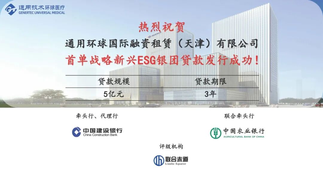 近日,通用技术环球医疗下属子公司---通用环球国际融资租赁(天津)有限公司(以下简称“环球天津”)成功落地天津市首笔战略新兴ESG银团贷款。此次银团贷款由中国建设银行担任代理行和牵头行...