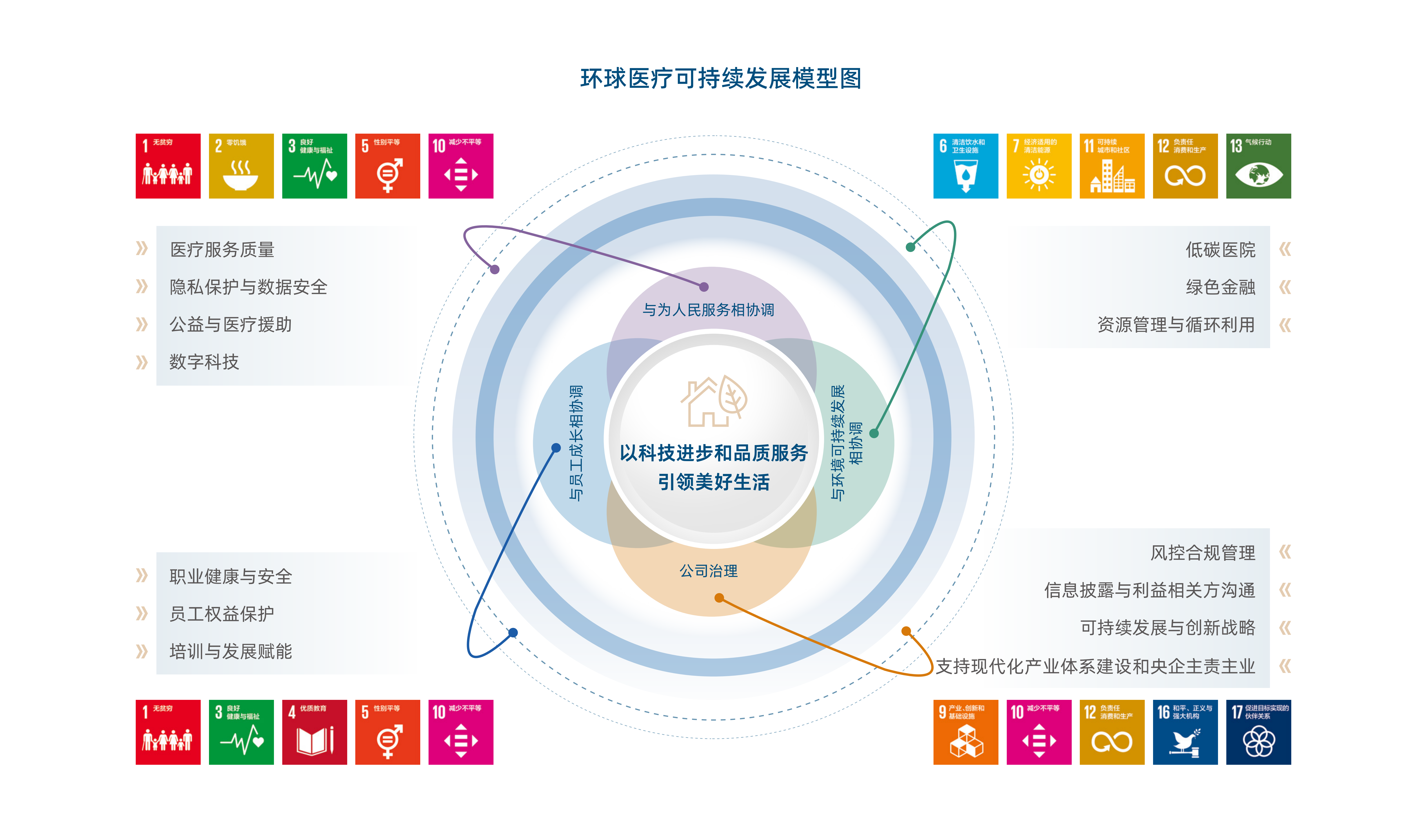2024年,我们明确了环球医疗可持续发展的四大战略目标,即通过持续提升的公司治理,努力实现企业发展与为人民服务相协调、与员工成长相协调、与环境可持续发展相协调、与利益相关方共赢,并将以上目标拆解落地为具体的工作规划,制定了相应的行动方案、里程碑目标、责任部门及战略执行监控方式等。未来,我们将通过战略监控及专项绩效考核机制、数字化系统及文化培训体系保障战略的有效落地,确保顺利完成战略目标。